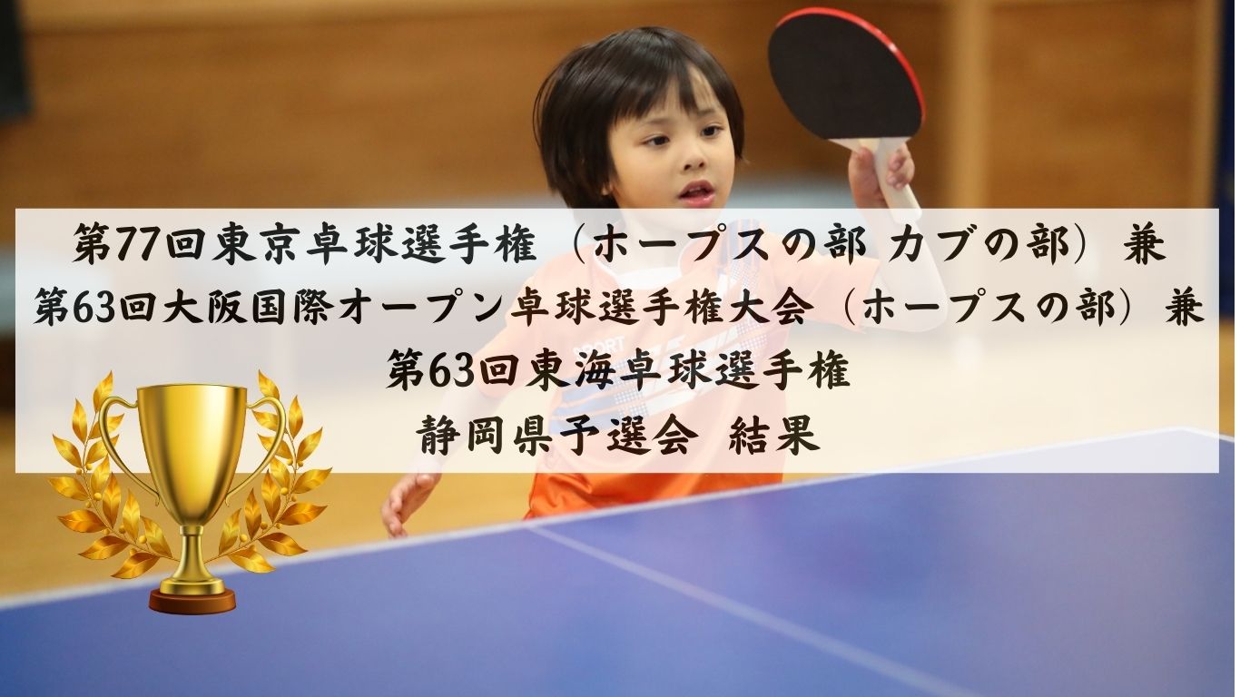 令和5年9月9日(土)に行われた第77回東京卓球選手権(ホープスの部 カブの部)兼第63回大阪国際オープン卓球選手権大会(ホープスの部)兼第63回東海卓球選手権静岡県予選会、10日(日)に行われた大阪オープン最終予選会の結果です。